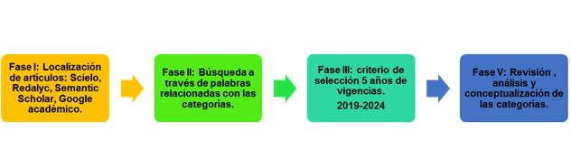 1. Fase I: Se localizaron artículos científicos en bases de datos como: Scielo, Redalyc, Latindex, Semantic Scholar y Google Académico.